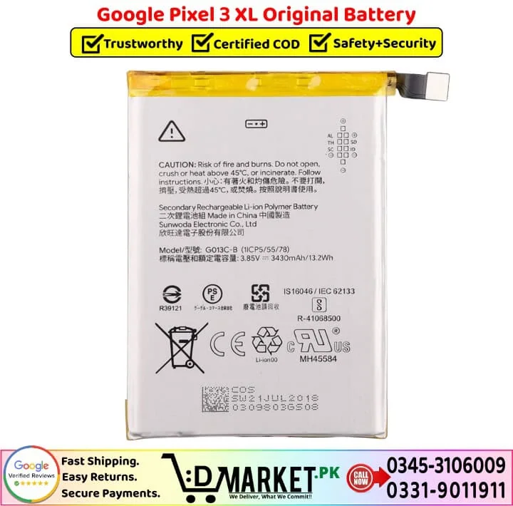 At D-LAB Repair Services, our experienced technicians provide professional battery replacement using OEM-grade parts. Whether your battery is swollen, faulty, or no longer delivering backup, we ensure safe removal of the old battery and proper installation of the new one.You can submit a request through our repair services page or visit our service center directly for complete assistance.We make buying the right battery for your device simple, reliable, and stress-free. Here’s why thousands of customers trust DMarket.Pk for their Google Pixel 3 XL Original Battery: