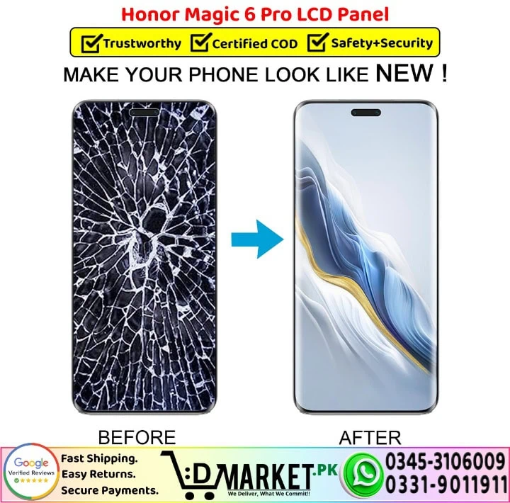 Option 2: Online Professional Repair with DMarket.pk Want expert repair from the comfort of your home? Our professional repair services at DMarket.pk make it easy! Simply visit our Repair Services page, fill out the form, and our agent will contact you with complete details and total charges. If you’re satisfied, courier your device to us. We’ll fix your Honor Magic 6 Pro LCD Panel screen and deliver it back fully repaired. Pay via cash on delivery only when you receive your fixed device. We believe this unique service sets us apart in Pakistan!