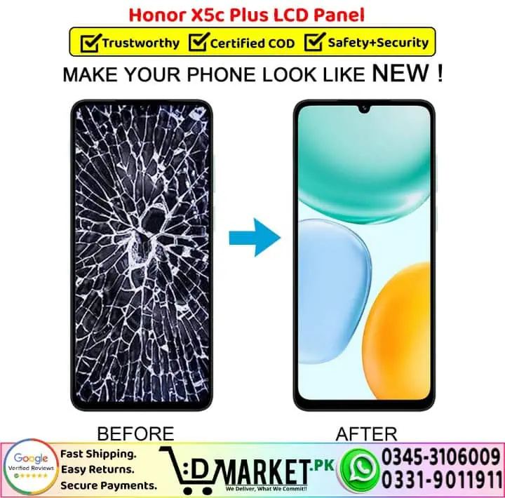 Option 2: Online Professional Repair with DMarket.pk Want expert repair from the comfort of your home? Our professional repair services at DMarket.pk make it easy! Simply visit our Repair Services page, fill out the form, and our agent will contact you with complete details and total charges. If you’re satisfied, courier your device to us. We’ll fix your Honor X5c Plus LCD Panel screen and deliver it back fully repaired. Pay via cash on delivery only when you receive your fixed device. We believe this unique service sets us apart in Pakistan!