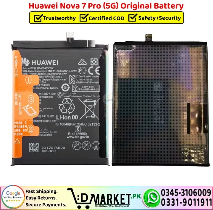 At D-LAB Repair Services, our experienced technicians provide professional battery replacement using OEM-grade parts. Whether your battery is swollen, faulty, or no longer delivering backup, we ensure safe removal of the old battery and proper installation of the new one.You can submit a request through our repair services page or visit our service center directly for complete assistance.We make buying the right battery for your device simple, reliable, and stress-free. Here’s why thousands of customers trust DMarket.Pk for their Huawei Nova 7 Pro 5G Original Battery: