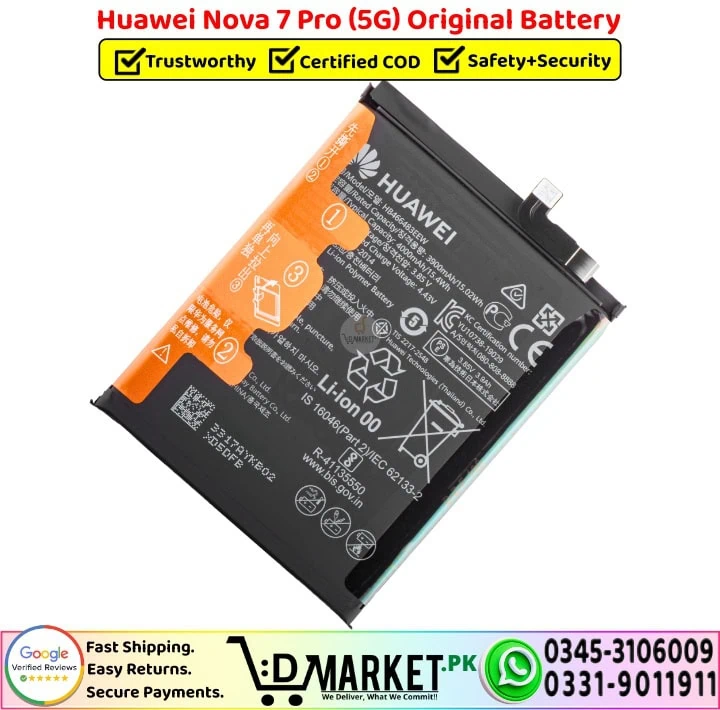 Order the Huawei Nova 7 Pro 5G Original Battery online from DMarket.pk with fast delivery, or buy directly from our Service Centre, both with OEM-grade tested quality.