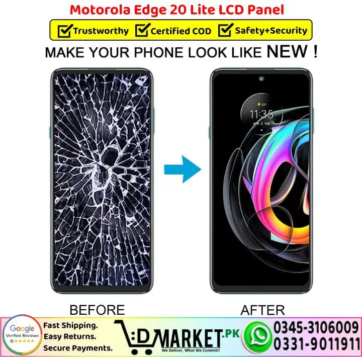 Option 2: Online Professional Repair with DMarket.pk Want expert repair from the comfort of your home? Our professional repair services at DMarket.pk make it easy! Simply visit our Repair Services page, fill out the form, and our agent will contact you with complete details and total charges. If you’re satisfied, courier your device to us. We’ll fix your Motorola Edge 20 Lite LCD Panel screen and deliver it back fully repaired. Pay via cash on delivery only when you receive your fixed device. We believe this unique service sets us apart in Pakistan!
