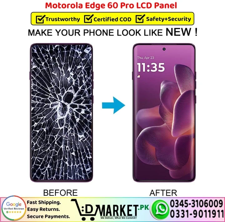 Option 2: Online Professional Repair with DMarket.pk Want expert repair from the comfort of your home? Our professional repair services at DMarket.pk make it easy! Simply visit our Repair Services page, fill out the form, and our agent will contact you with complete details and total charges. If you’re satisfied, courier your device to us. We’ll fix your Motorola Edge 60 Pro LCD Panel screen and deliver it back fully repaired. Pay via cash on delivery only when you receive your fixed device. We believe this unique service sets us apart in Pakistan!