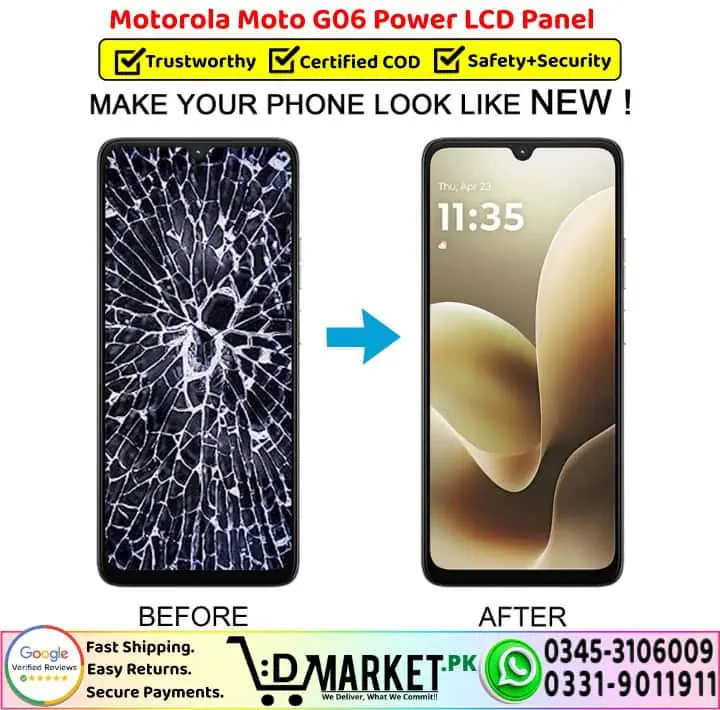 Option 2: Online Professional Repair with DMarket.pk Want expert repair from the comfort of your home? Our professional repair services at DMarket.pk make it easy! Simply visit our Repair Services page, fill out the form, and our agent will contact you with complete details and total charges. If you’re satisfied, courier your device to us. We’ll fix your Motorola Moto G06 Power LCD Panel screen and deliver it back fully repaired. Pay via cash on delivery only when you receive your fixed device. We believe this unique service sets us apart in Pakistan!