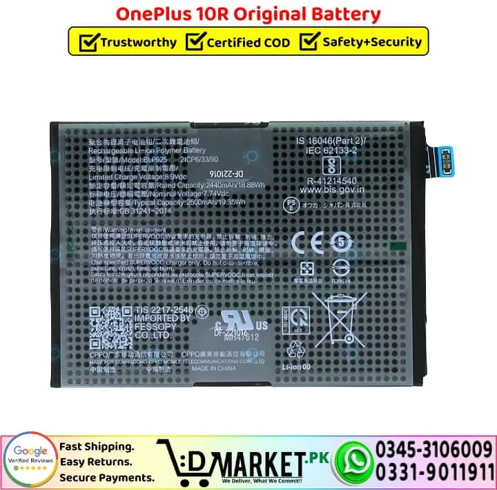 Order the OnePlus 10R Original Battery online from DMarket.pk with fast delivery, or buy directly from our Service Centre, both with OEM-grade tested quality.