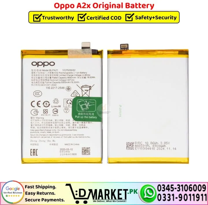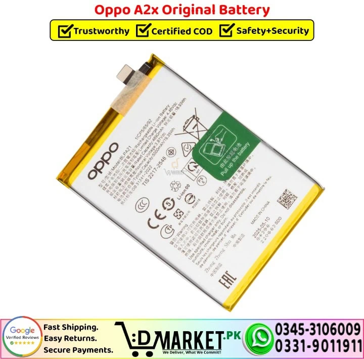 At D-LAB Repair Services, our experienced technicians provide professional battery replacement using OEM-grade parts. Whether your battery is swollen, faulty, or no longer delivering backup, we ensure safe removal of the old battery and proper installation of the new one.You can submit a request through our repair services page or visit our service center directly for complete assistance.We make buying the right battery for your device simple, reliable, and stress-free. Here’s why thousands of customers trust DMarket.Pk for their Oppo A2x Original Battery: