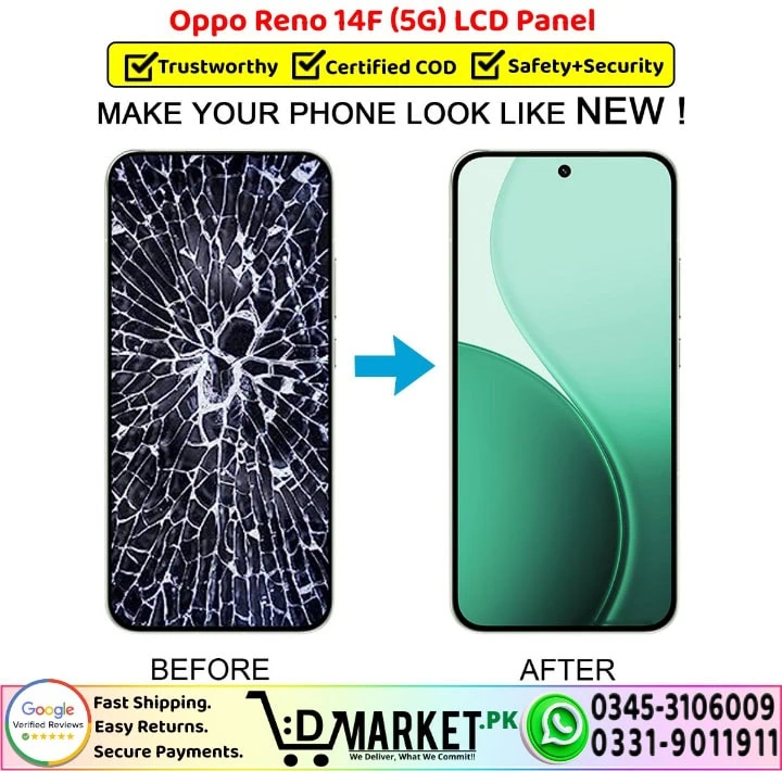 Option 2: Online Professional Repair with DMarket.pk Want expert repair from the comfort of your home? Our professional repair services at DMarket.pk make it easy! Simply visit our Repair Services page, fill out the form, and our agent will contact you with complete details and total charges. If you’re satisfied, courier your device to us. We’ll fix your Oppo Reno 14F 5G LCD Panel screen and deliver it back fully repaired. Pay via cash on delivery only when you receive your fixed device. We believe this unique service sets us apart in Pakistan!