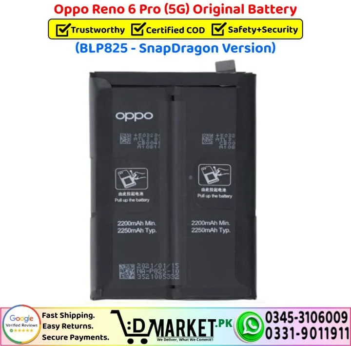 Order the Oppo Reno 6 Pro 5G Original Battery online from DMarket.pk with fast delivery, or buy directly from our Service Centre, both with OEM-grade tested quality.