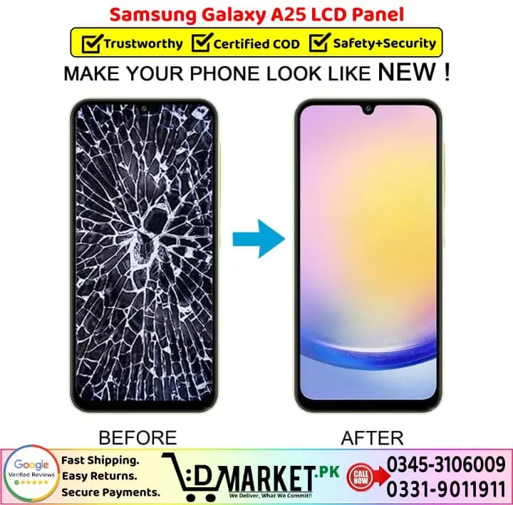 Option 2: Online Professional Repair with DMarket.pk Want expert repair from the comfort of your home? Our professional repair services at DMarket.pk make it easy! Simply visit our Repair Services page, fill out the form, and our agent will contact you with complete details and total charges. If you’re satisfied, courier your device to us. We’ll fix your Samsung Galaxy A25 LCD Panel screen and deliver it back fully repaired. Pay via cash on delivery only when you receive your fixed device. We believe this unique service sets us apart in Pakistan!