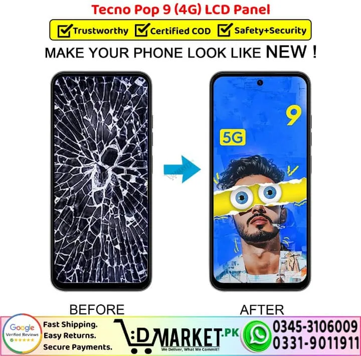 Option 2: Online Professional Repair with DMarket.pk Want expert repair from the comfort of your home? Our professional repair services at DMarket.pk make it easy! Simply visit our Repair Services page, fill out the form, and our agent will contact you with complete details and total charges. If you’re satisfied, courier your device to us. We’ll fix your Tecno Pop 9 4G LCD Panel screen and deliver it back fully repaired. Pay via cash on delivery only when you receive your fixed device. We believe this unique service sets us apart in Pakistan!