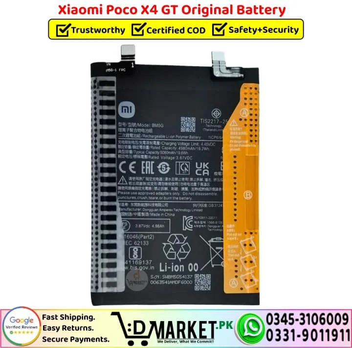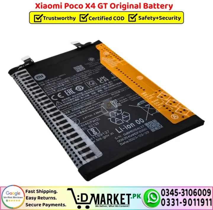At D-LAB Repair Services, our experienced technicians provide professional battery replacement using OEM-grade parts. Whether your battery is swollen, faulty, or no longer delivering backup, we ensure safe removal of the old battery and proper installation of the new one.You can submit a request through our repair services page or visit our service center directly for complete assistance.We make buying the right battery for your device simple, reliable, and stress-free. Here’s why thousands of customers trust DMarket.Pk for their Xiaomi Poco X4 GT Original Battery:
