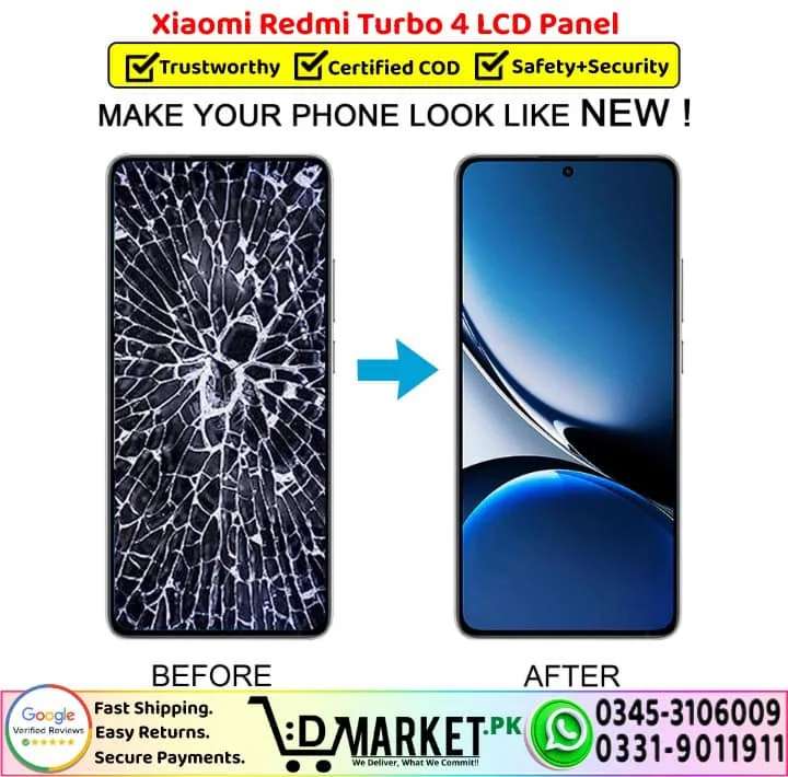 Option 2: Online Professional Repair with DMarket.pk Want expert repair from the comfort of your home? Our professional repair services at DMarket.pk make it easy! Simply visit our Repair Services page, fill out the form, and our agent will contact you with complete details and total charges. If you’re satisfied, courier your device to us. We’ll fix your Xiaomi Redmi Turbo 4 LCD Panel screen and deliver it back fully repaired. Pay via cash on delivery only when you receive your fixed device. We believe this unique service sets us apart in Pakistan!